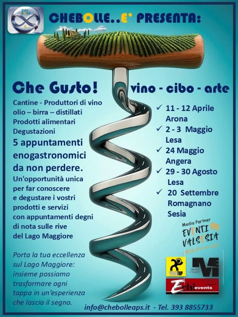 Nel weekend del 11-12 Aprile si terrà l’appuntamento enograstronomico: Che Bolle ad Arona, una manifestazione che riporta il vino anche al suo carattere originario di elemento portante della tavola: degustazioni, prodotti alimentari tipici, abbinamenti, cucina e tutto il variegato mondo enogastronomico di cui sono ricche tutte le regioni italiane.