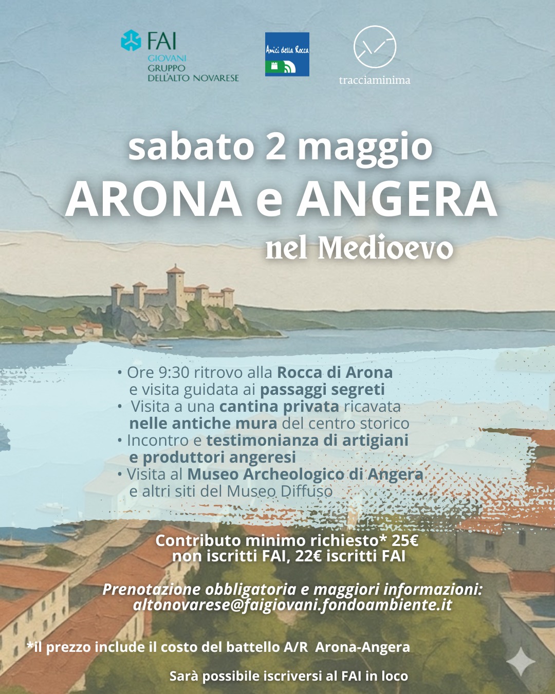 Sabato 2 maggio 2026 dalle ore 9:30 alle ore 17:30, si svolgerà Arona e Angera nel Medioevo, evento realizzato dal FAI Giovani Gruppo dell’Alto Novarese in collaborazione con Amici della Rocca e Tracciaminima.