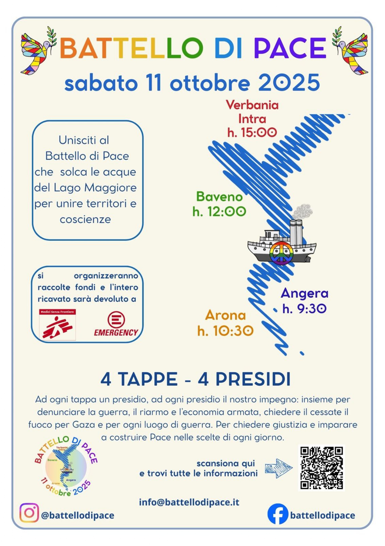 Sabato 11 ottobre 2025 salperà dal porto di Angera il Battello di Pace, un viaggio simbolico e partecipato che attraverserà il Lago Maggiore con l’obiettivo di diffondere un messaggio di pace, solidarietà, impegno civile alternativo al linguaggio della guerra e dei riarmi. Da tutto il Lago si alzeranno voci per la pace, contro logiche bellicistiche e di riarmo come unica soluzione a fianco di ogni vittima di guerra! Un richiamo alle nostre responsabilità e un impegno concreto per la Pace. Il battello effettuerà quattro tappe: Angera, Arona, Baveno e Intra: