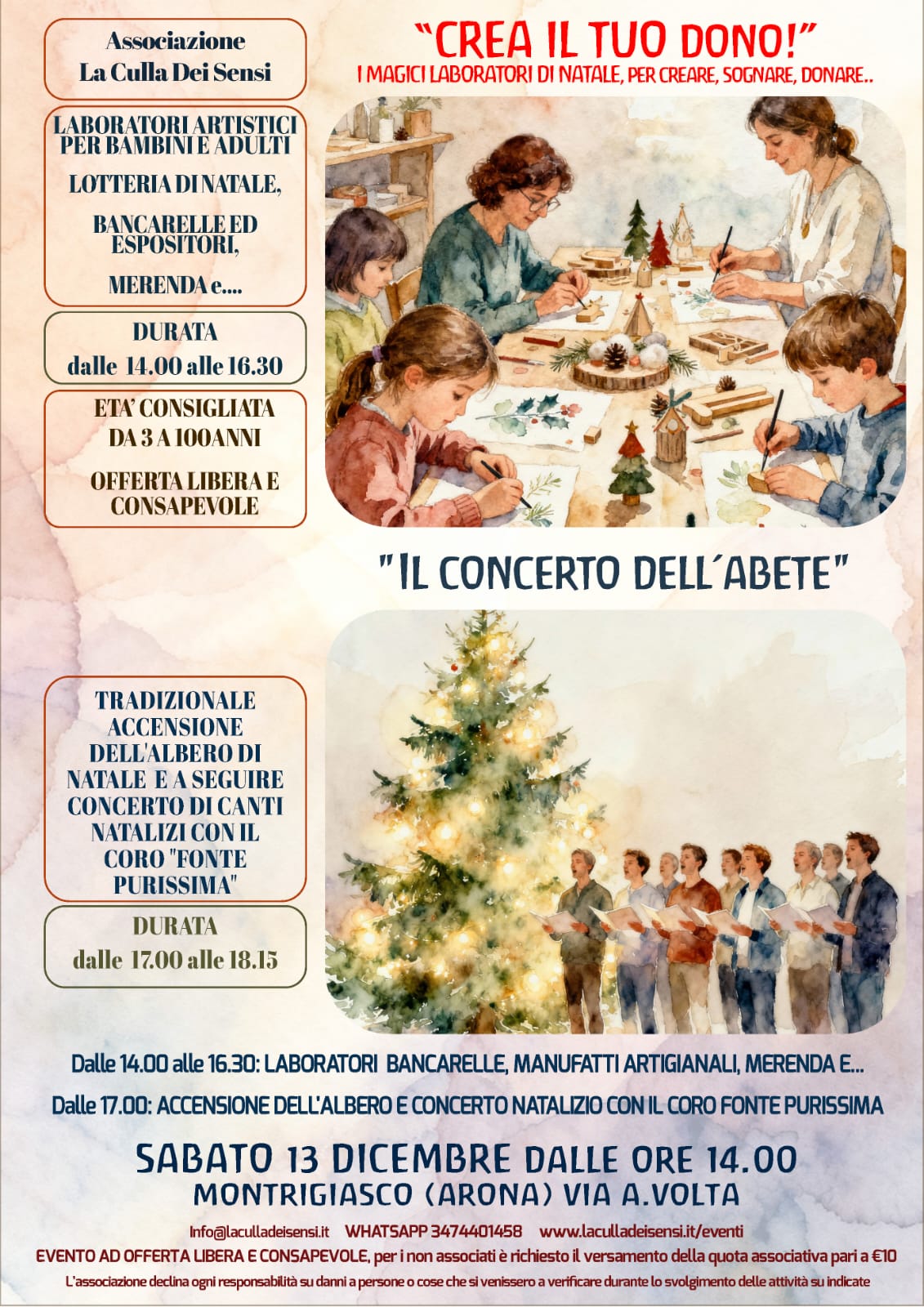 Sabato 13 dicembre dalle ore 14:00 alle ore 16:30 si terrà il laboratorio creativo di Natale “Crea il tuo dono!”, per adulti e bambini a partire dai 3 anni. Evento ad offerta libera e consapevole.
