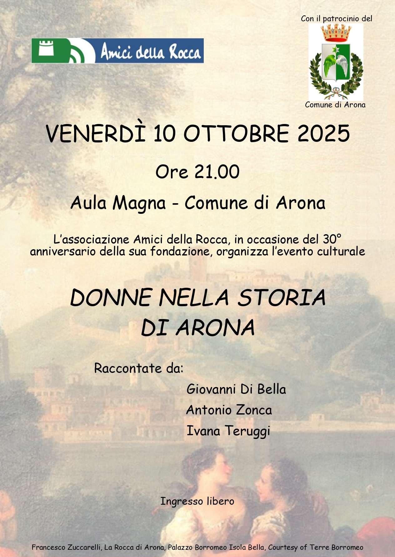 In occasione del 30° anniversario della fondazione dell’Associazione Amici della Rocca Venerdì 10 Ottobre 2025 alle ore 21:00 si terrà l’incontro Donne nella storia di Arona raccontate da Giovanni Di Bella, Antonio Zonca, Ivana Teruggi.