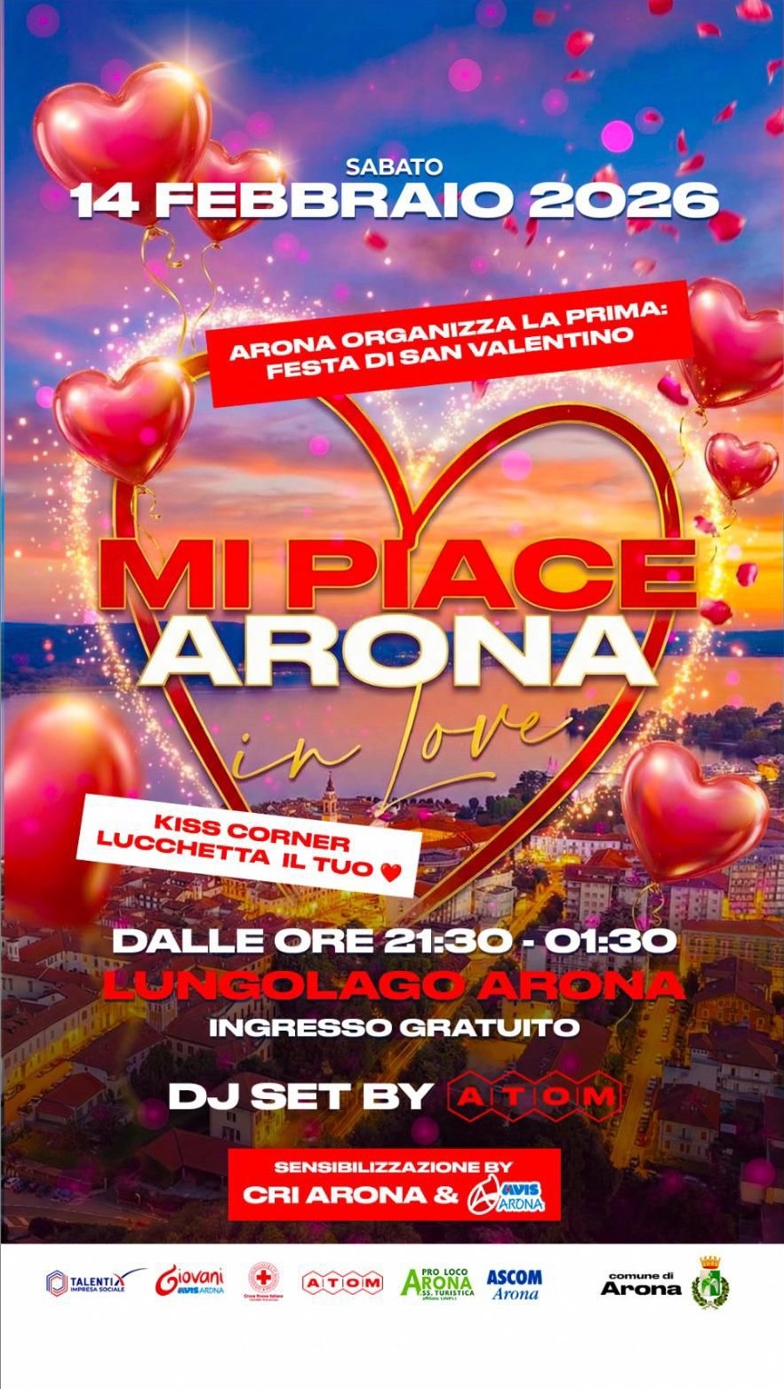 Sabato 14 febbraio Arona organizza la prima festa di San Valentino intitolata “Mi Piace Arona in Love” con Kiss Corner e Lucchetta il tuo cuore – dalle 21:30 alle 01:30 presso il Lungolago Dj set con AtomX e sensibilizzazione con CRI Arona/Lesa e AVIS Arona.