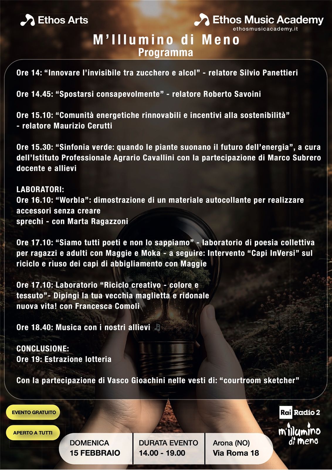 L’evento “M’Illumino di Meno”, promosso da Ethos Arts ed Ethos Music Academy, si terrà domenica 15 febbraio, dalle ore 14.00 alle 19.00, presso la sede associativa in Via Roma 18 – Arona (NO).