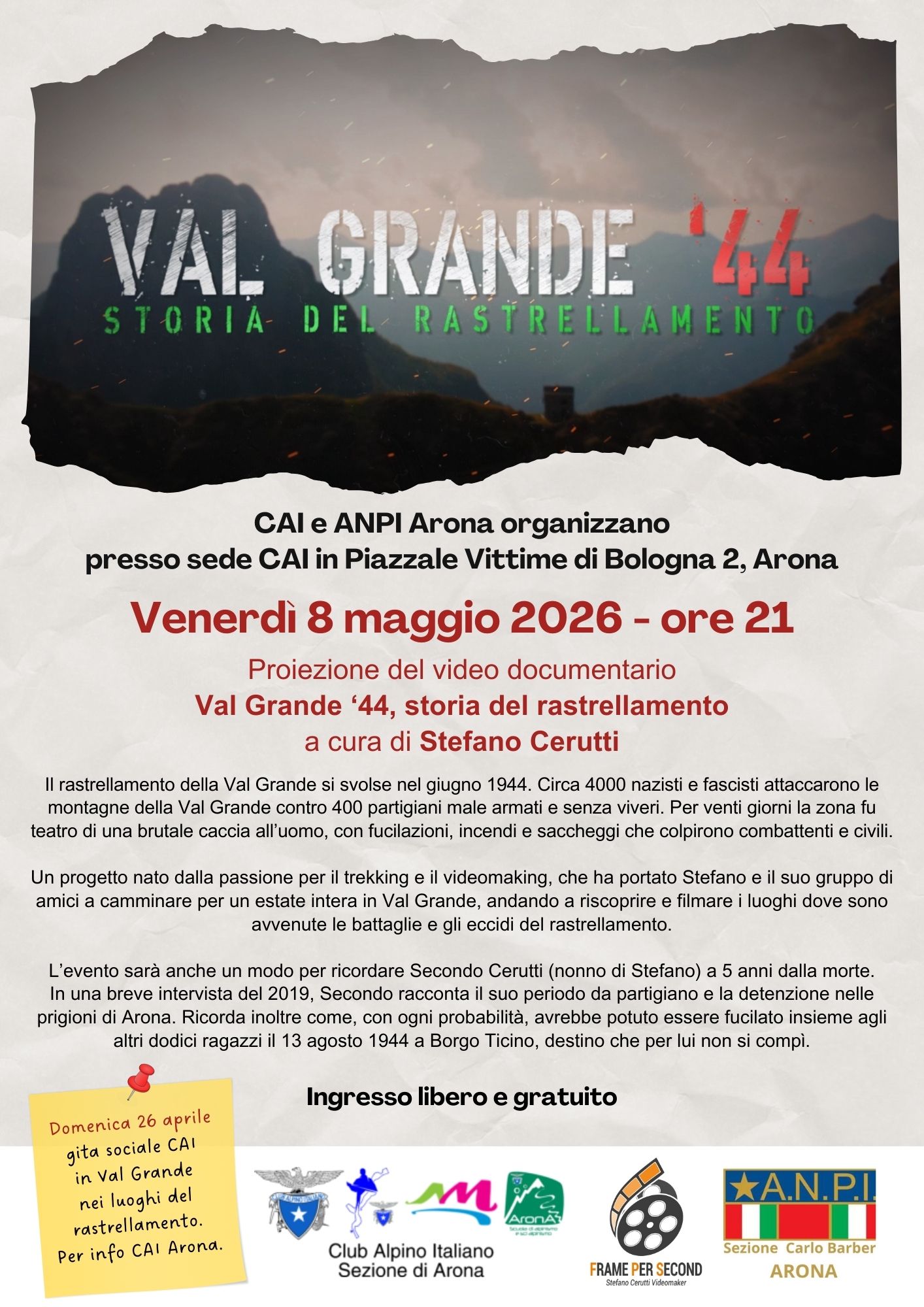 Venerdì 8 maggio 2026 alle ore 21:00, presso la Sede Club Alpino Italiano Sezione Arona, si terrà la proiezione del documentario “Val Grande ’44, storia del rastrellamento” a cura di Stefano Cerutti.