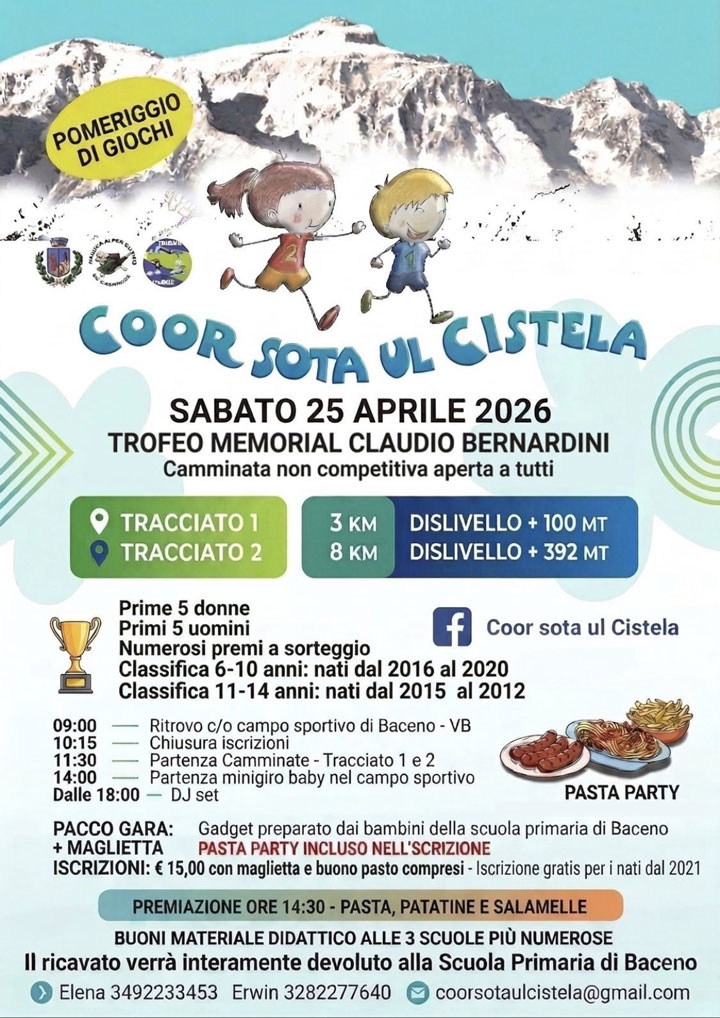 Sabato 25 aprile dalle ore 09.00 si terrà la camminata non competitiva aperta a tutti “Coor sota ul Cistela” Trofeo in Memorial Claudio Bernardini.