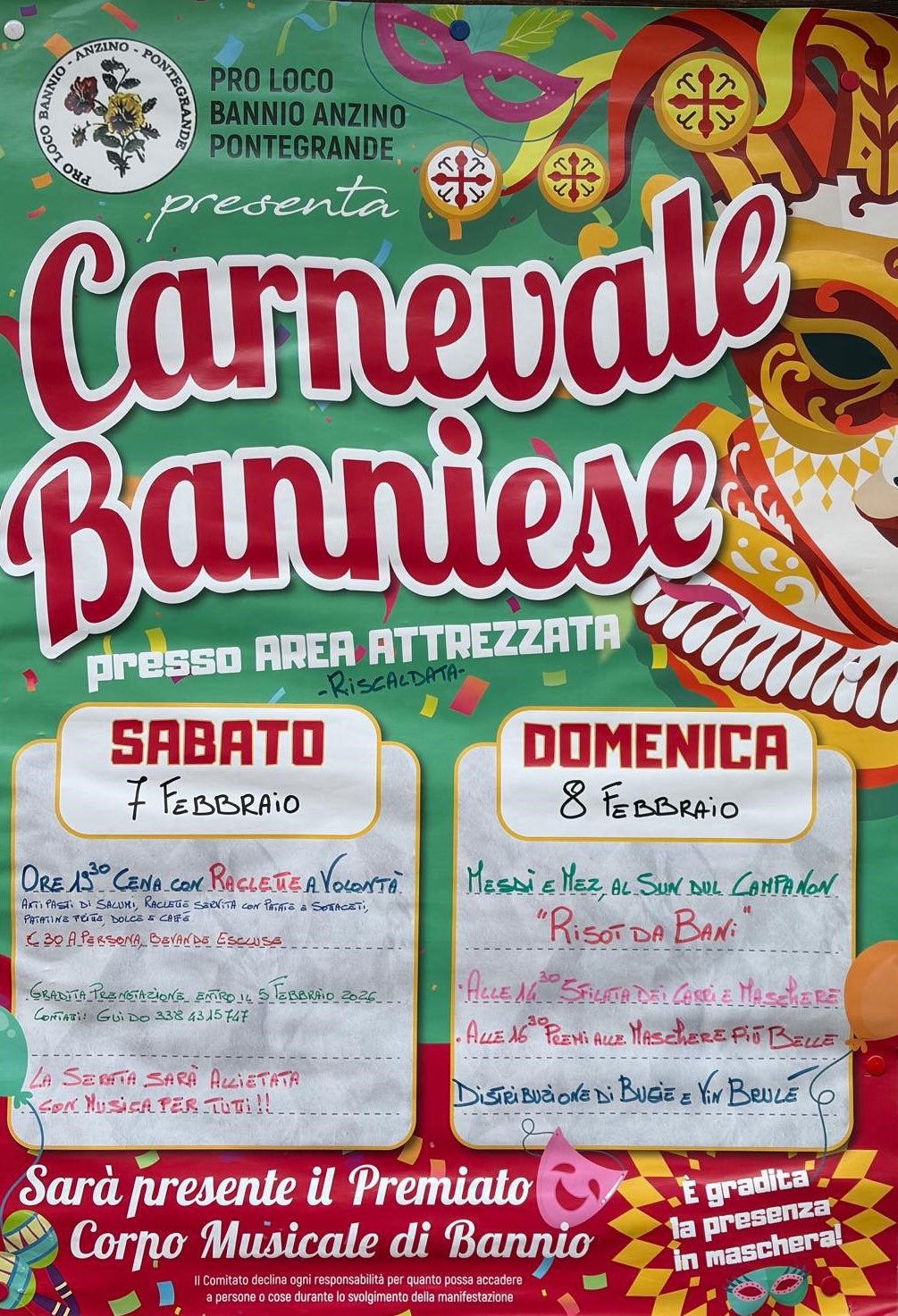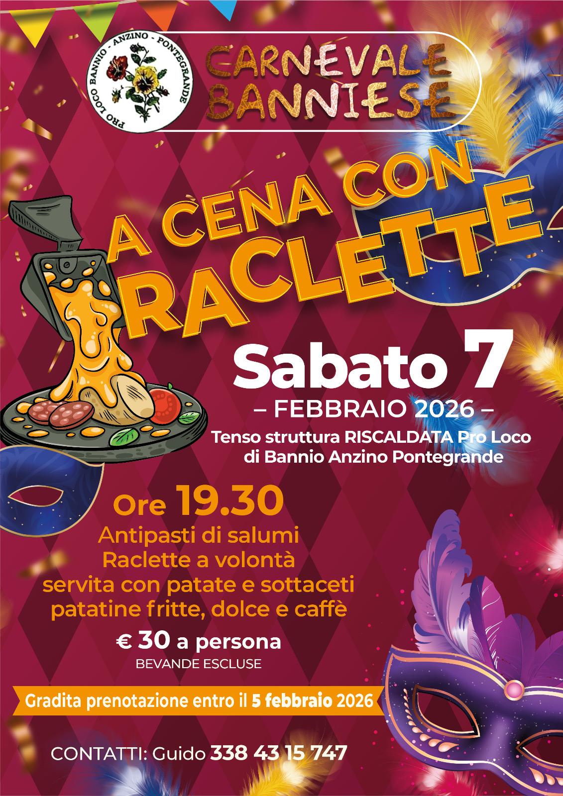Nell’ambito del Carnevale Banniese, la Pro Loco di Bannio Anzino – Pontegrande organizza una gustosa cena conviviale con raclette e un pranzo con squisito risotto da gustare in allegria.