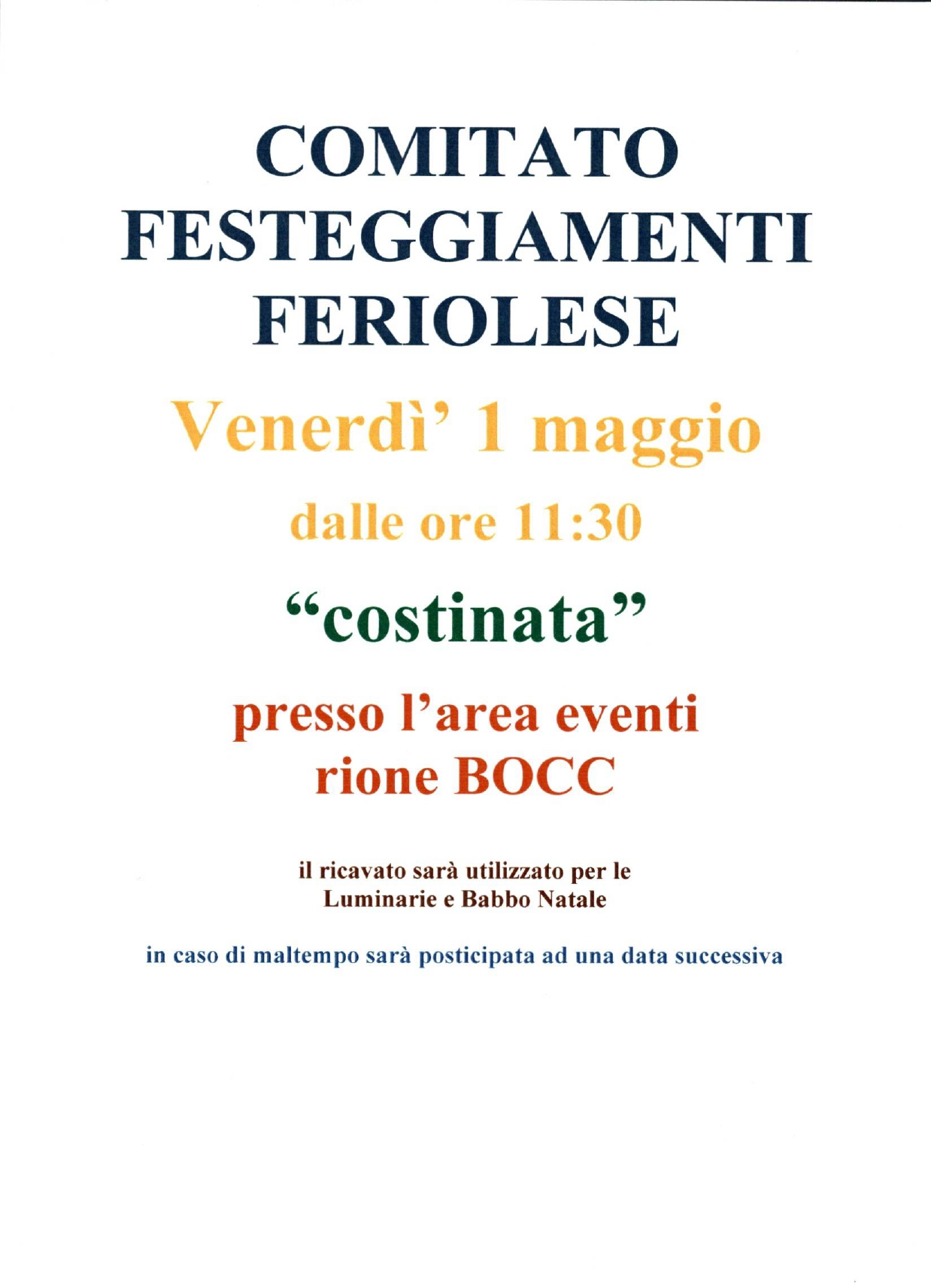 Venerdì 1 maggio 2026, si terrà la tradizionale Costinata del Böcc da asporto presso la nuova area eventi a Feriolo, a partire dalle ore 11.30.