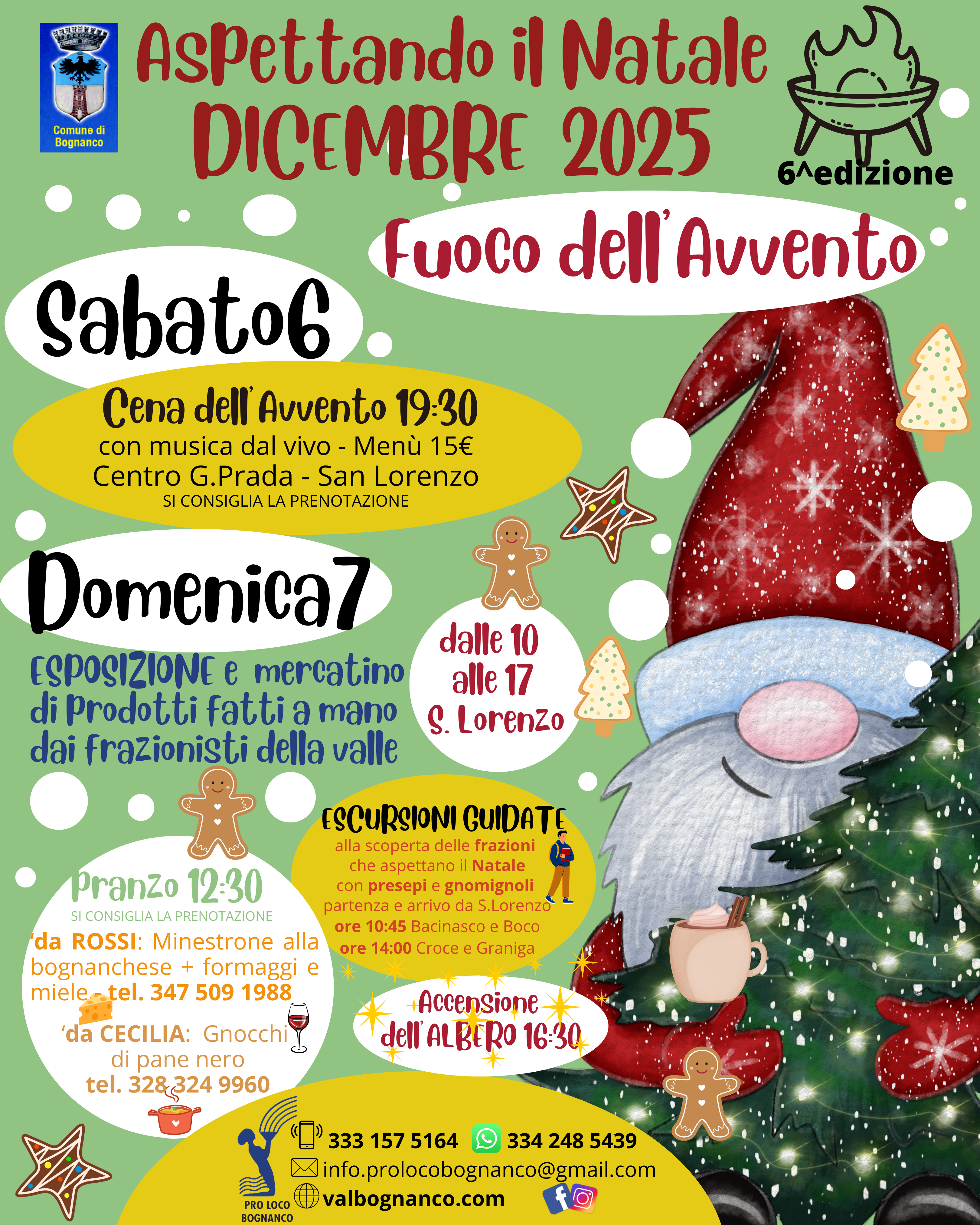 Domenica 7 DICEMBRE,  dalle 10 alle 17, nella PIAZZA di San Lorenzo, davanti alla Chiesa Parrocchiale, troverete tantissime bancarelle di oggetti fatti a mano dai frazionisti di tutta la valle Bognanco, raccolta fondi per piccole necessità delle frazioni stesse, con i piccoli produttori locali, oltre alle golose proposte della pro loco vin brulè, la cioccolata calda, i dolcetti, renderanno la vostra giornata ancora più speciale.