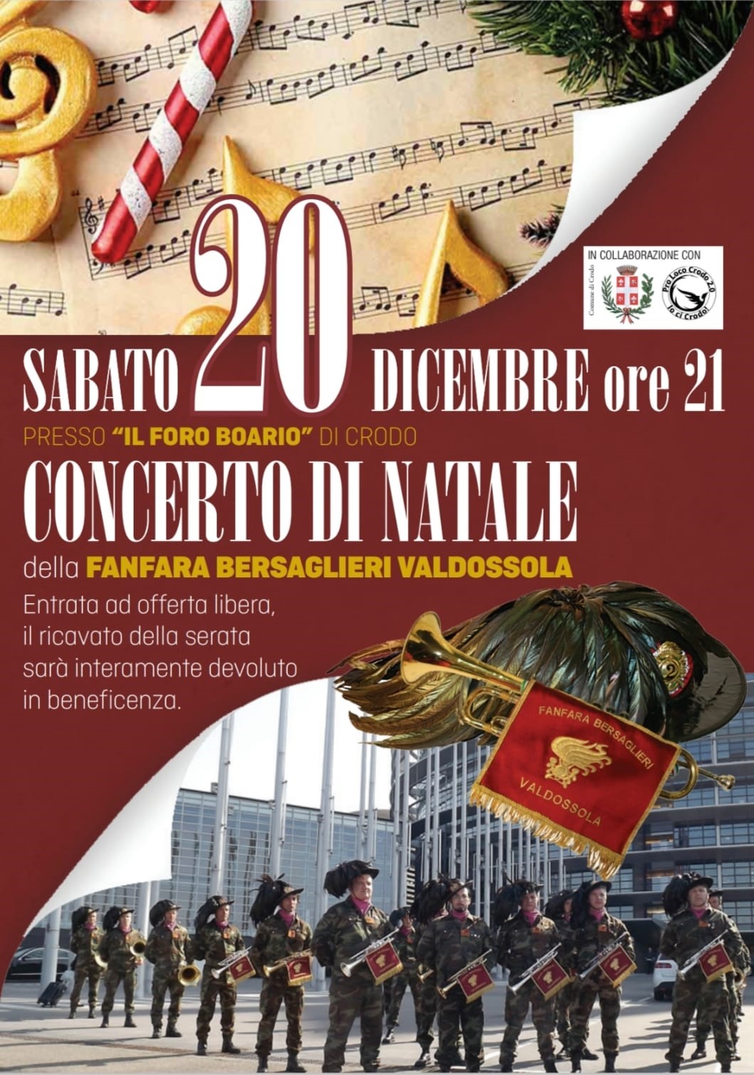 Sabato 20 dicembre alle 21.00 presso il Foro Boario di Crodo si terrà una serata con il concerto di Natale della Fanfara Bersaglieri Valdossola. Il programma musicale proporrà una selezione di brani natalizi tra i più amati e le melodie che rappresentano la tradizione bersaglieresca, eseguite con la passione, la disciplina e l’energia che da sempre contraddistinguono la Fanfara. Un percorso musicale pensato per coinvolgere ed emozionare il pubblico, creando un’atmosfera calda e festosa.