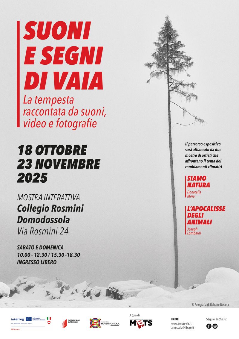 dal 18 ottobre al 23 novembre si terrà la mostra interattiva “Suoni e segni di Vaia. La tempesta raccontata dai suoni, video e fotografie” è presso il Collegio Mellerio Rosmini di Domodossola (VB).