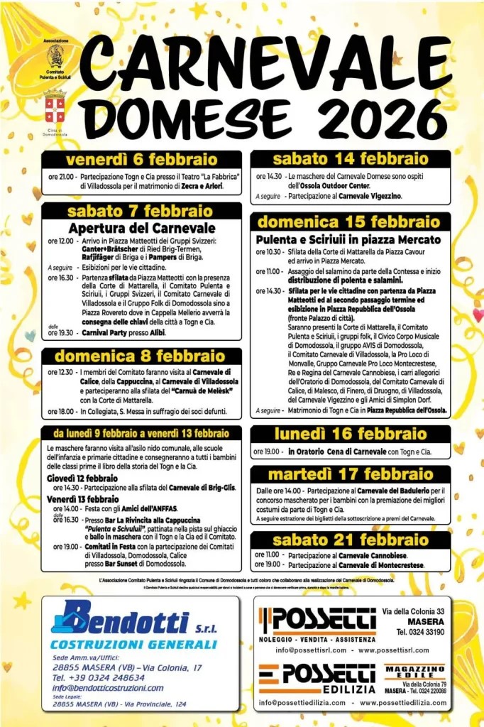 Saranno presenti la Corte di Mattarella, il Comitato Pulenta e Sciriuii, i gruppi folk, il Civico Corpo Musicale di Domodossola, il gruppo AVIS di Domodossola, il Comitato Carnevale di Villadossola, la Pro Loco di Monvalle, gli Amis della Cannobina, Gruppo Carnevale Pro Loco Montecrestese, Re e Regina del Carnevale Cannobiese, i carri allegorici dell’Oratorio di Domodossola, del Comitato Carnevale di Calice, di Malesco, di Finero, di Druogno, di Villadossola, del Carnevale Vigezzino e gli amici di Simplon Dorf.