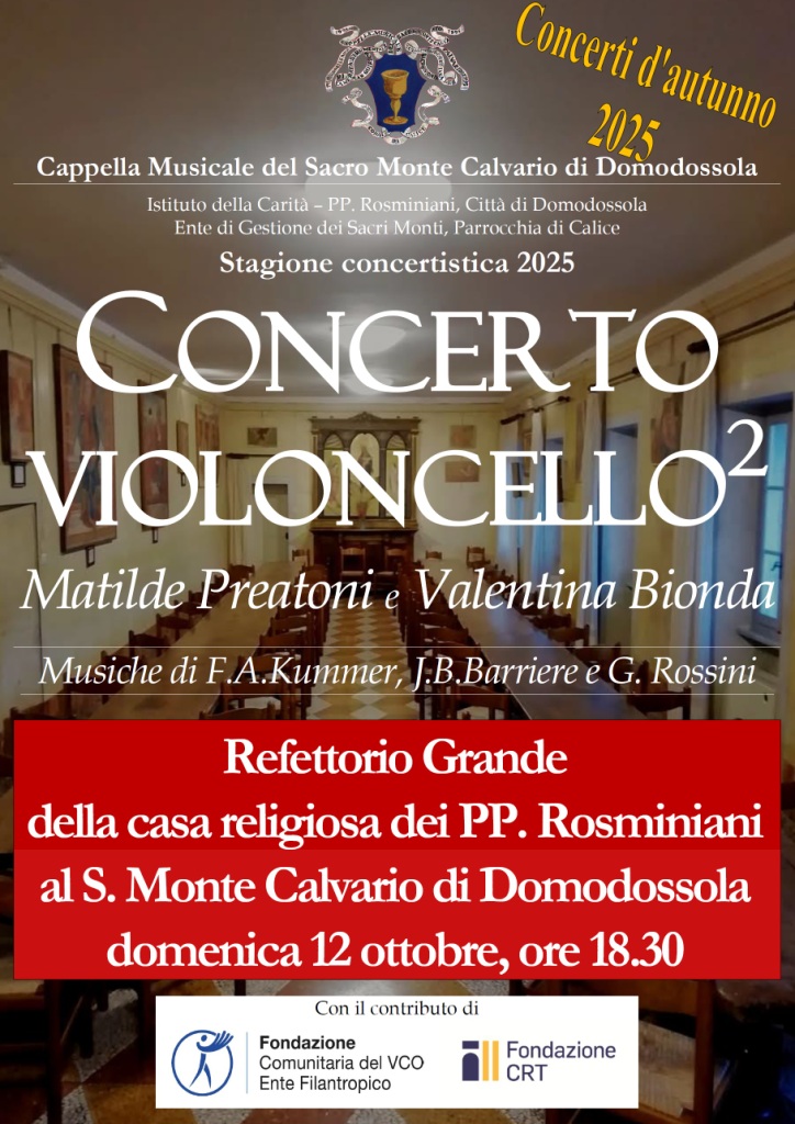 Si aprirà domenica 12 ottobre alle ore 18:30 la VII rassegna dei “Concerti d’autunno 2025”, nell’ambito della stagione concertistica 2025 della Cappella Musicale del Sacro Monte Calvario; nel Refettorio Grande del convento dei PP. Rosminiani al Sacro Monte Calvario di Domodossola con il “Violoncello 2” che vedrà impegnate le violoncelliste Matilde Preatoni e Valentina Bionda in un  programma di musiche di F. A. Kummer, J. B. Barriere e G. Rossini.