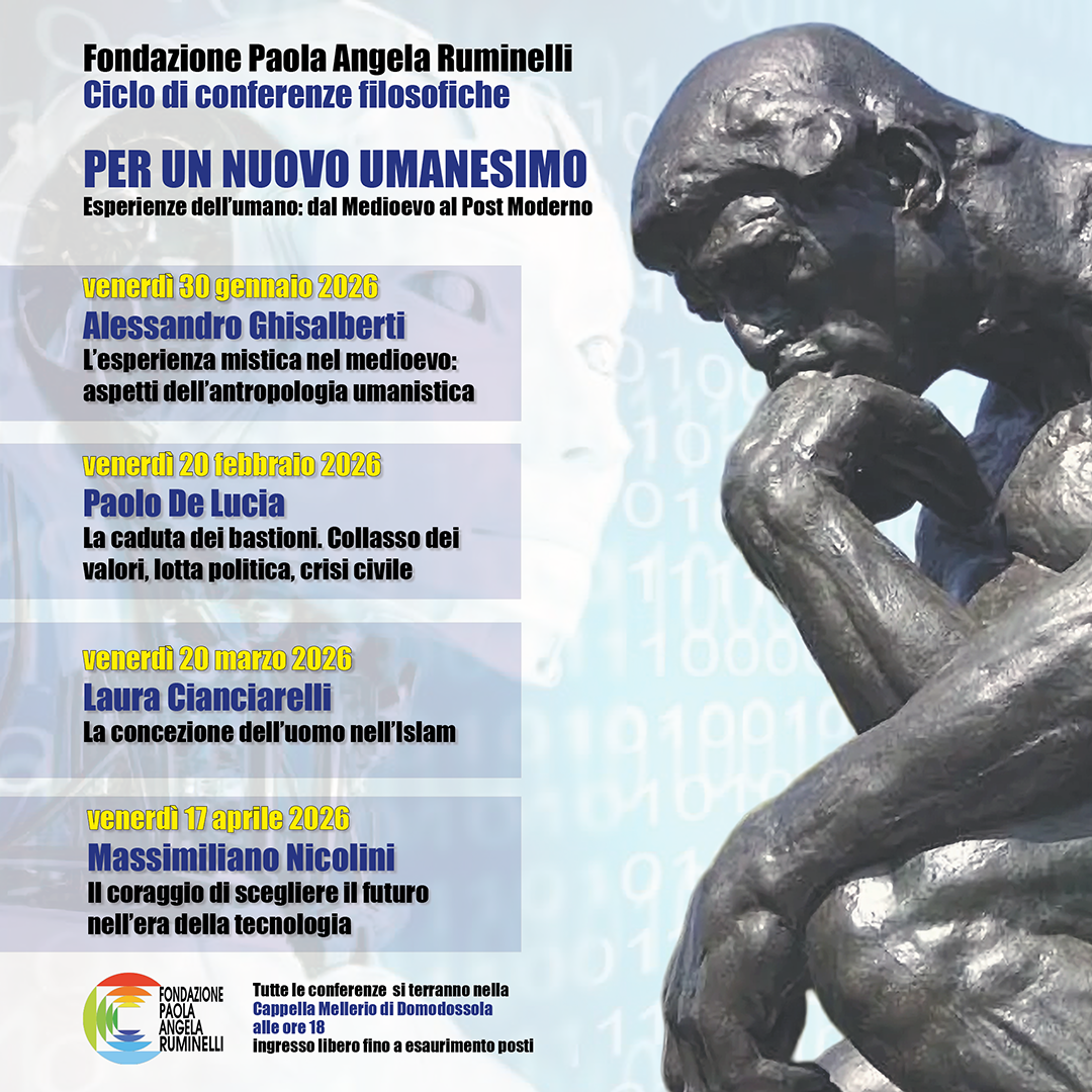 Dopo il successo degli incontri organizzati nelle ultime stagioni, anche nel 2026 l’Associazione Culturale Mario Ruminelli e la Fondazione Paola Angela Ruminelli organizzano un ciclo di quattro conferenze filosofiche dal titolo Per un nuovo umanesimo. Esperienze dell’umano: dal Medioevo al Post Moderno, in calendario, un venerdì al mese, dal 30 gennaio al 17 aprile.