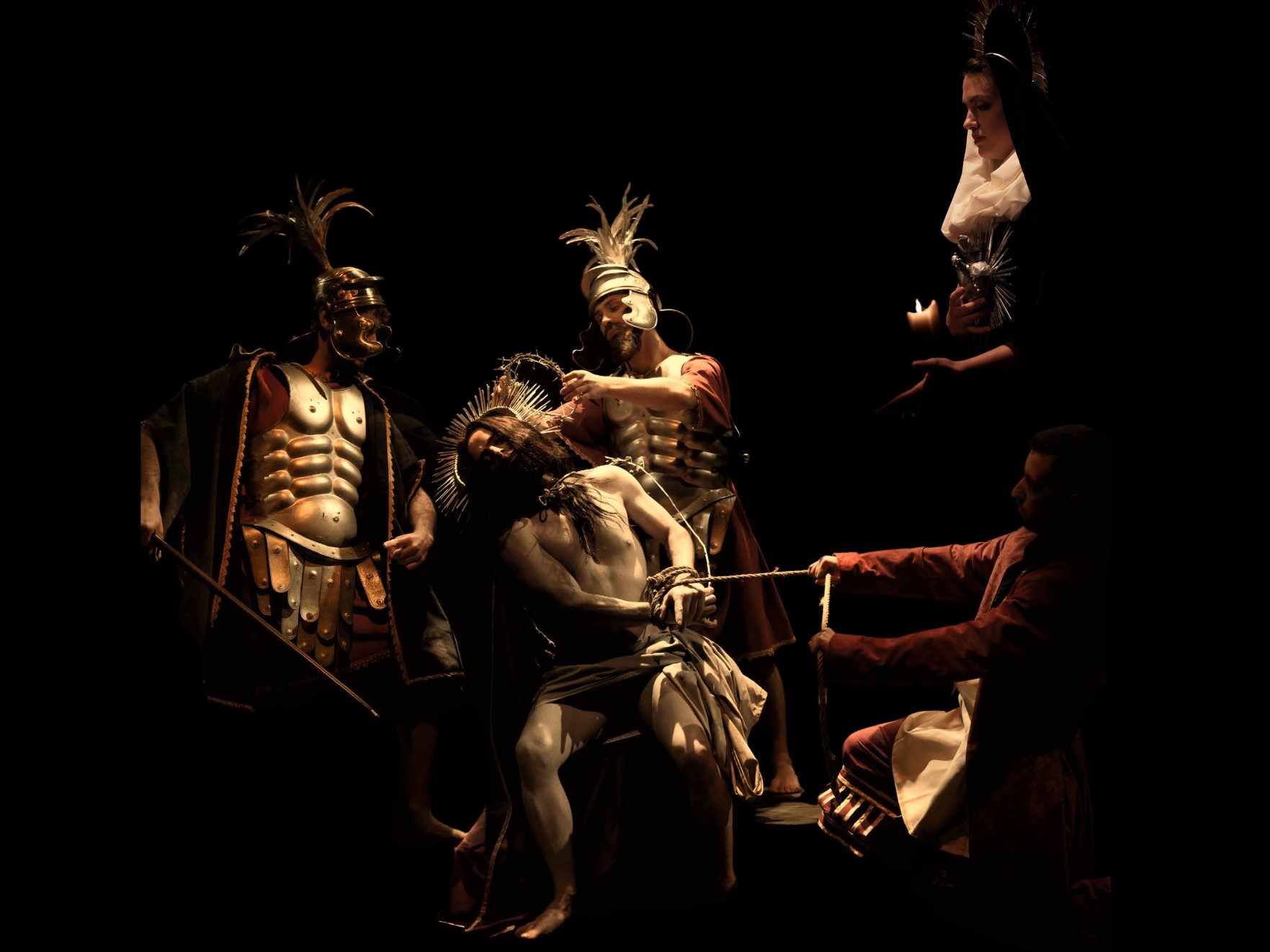 Con la regia di Renato Bonajuto e la direzione di Massimo Fiocchi Malaspina, personaggi barocchi e statuari si muovono in vivaci tableaux ispirati alle tele caravaggesche. Corpi, gesti e luci si trasformano in un suggestivo dialogo tra musica e storia dell’arte. Grazie alle scene e ai costumi di Danilo Coppola e alle coreografie di Giuliano De Luca, immagini vive e plastiche emergono dalla tela e abbracciano le voci del soprano Lucrezia Drei e del mezzosoprano Sofio Janelidze, sulle note dell’ensemble strumentale di Tones on the Stones, per donare al pubblico uno spettacolo in cui la contemplazione artistica diventa catarsi e rivelazione dell’anima.