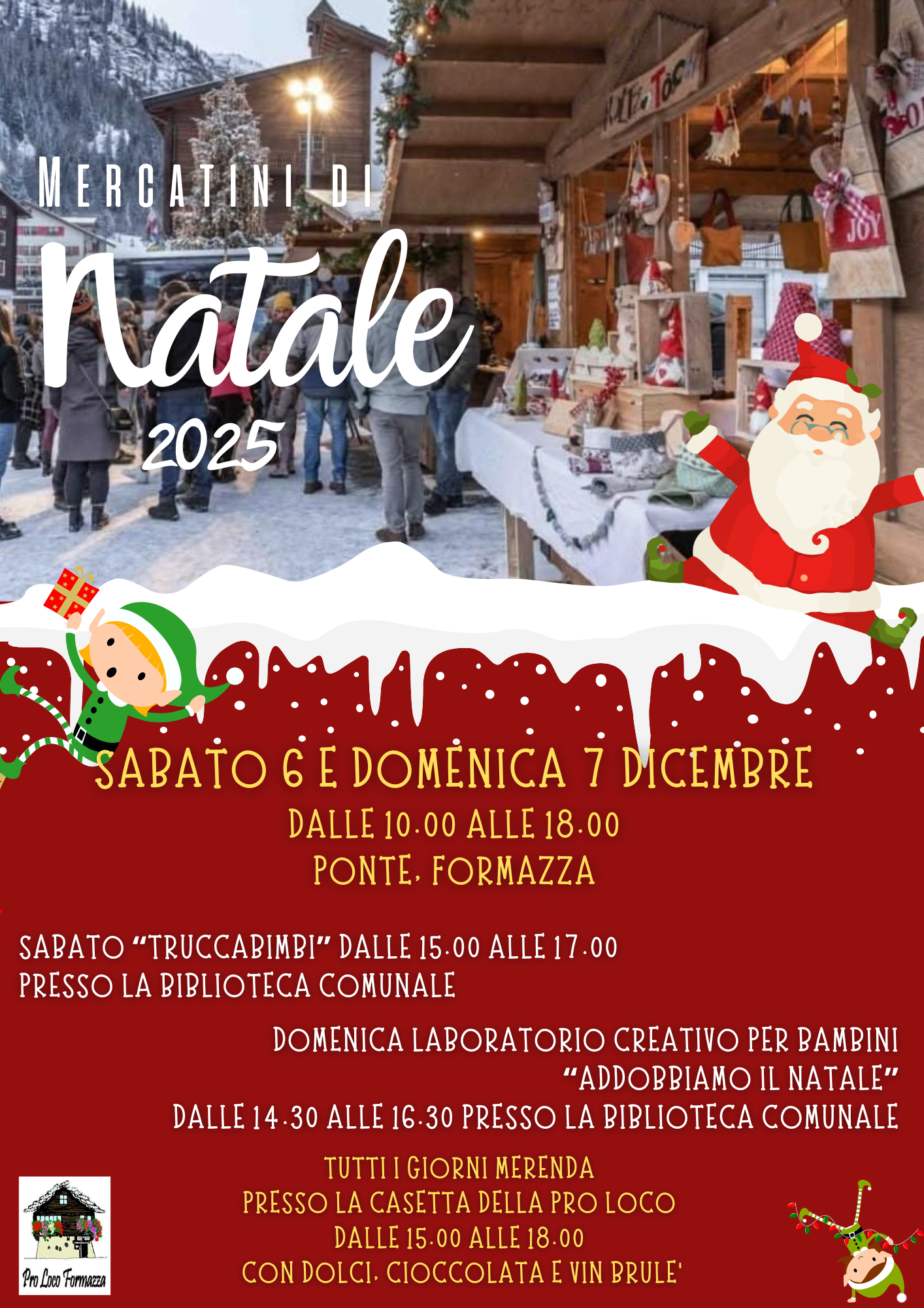 Nel weekend di sabato 6 e domenica 7 dicembre 2025, la frazione di Ponte, in Val Formazza, si vestirà di magia per i tradizionali Mercatini di Natale. Dalle 10:00 alle 18:00 sarà possibile passeggiare tra le bancarelle, scoprendo oggetti artigianali e tante idee regalo. Non mancheranno momenti dedicati ai più piccoli: il sabato pomeriggio i bambini potranno divertirsi con il laboratorio “Truccabimbi” presso la Biblioteca Comunale, mentre la domenica sarà la volta del laboratorio creativo “Addobbiamo il Natale”, dove potranno dare sfogo alla fantasia preparando decorazioni natalizie. Ogni pomeriggio, dalle 15:00 alle 18:00, la casetta della Pro Loco offrirà una gustosa merenda con dolci, cioccolata calda e vin brulè, per riscaldare l’atmosfera e condividere insieme lo spirito del Natale. Un appuntamento imperdibile per vivere la magia delle feste tra tradizione, allegria e convivialità.