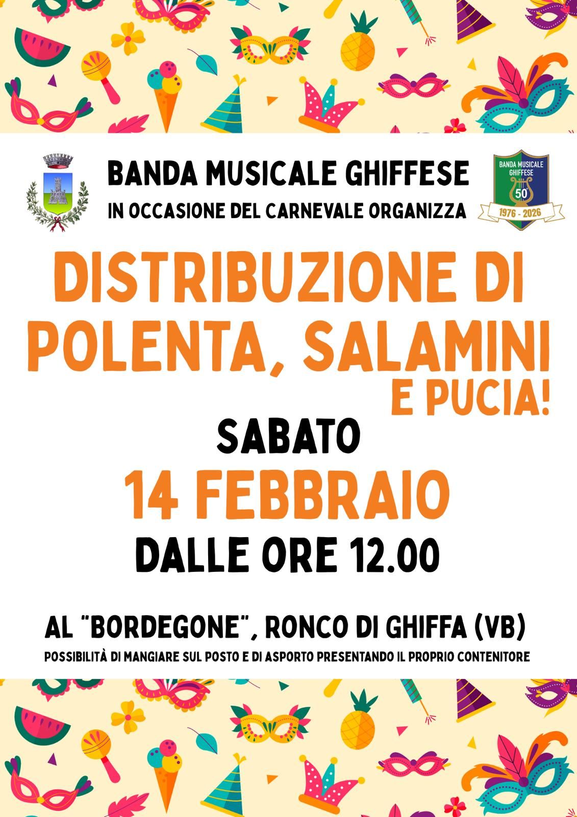 La Banda Musicale Ghiffese, in occasione del Carnevale, organizza la tradizionale distribuzione di Polenta, salamini e Pucia al “Bordegone” di Ronco.