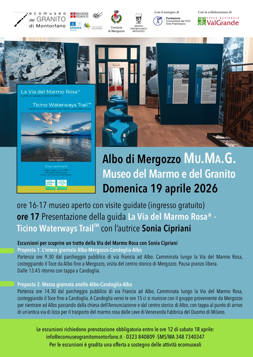 Domenica 19 aprile alle ore 17:00 l’Ecomuseo del Granito, con la collaborazione del Parco Nazionale Val Grande e del Gruppo Archeologico Mergozzo, propone presso il Mu.Ma.G. Museo del Marmo Rosa e del Granito in frazione Albo un’iniziativa di presentazione della guida “La Via del Marmo Rosa® – Ticino Waterways Trail” di Sonia Cipriani, con l’Autrice in dialogo con la coordinatrice dell’Ecomuseo Elena Poletti.