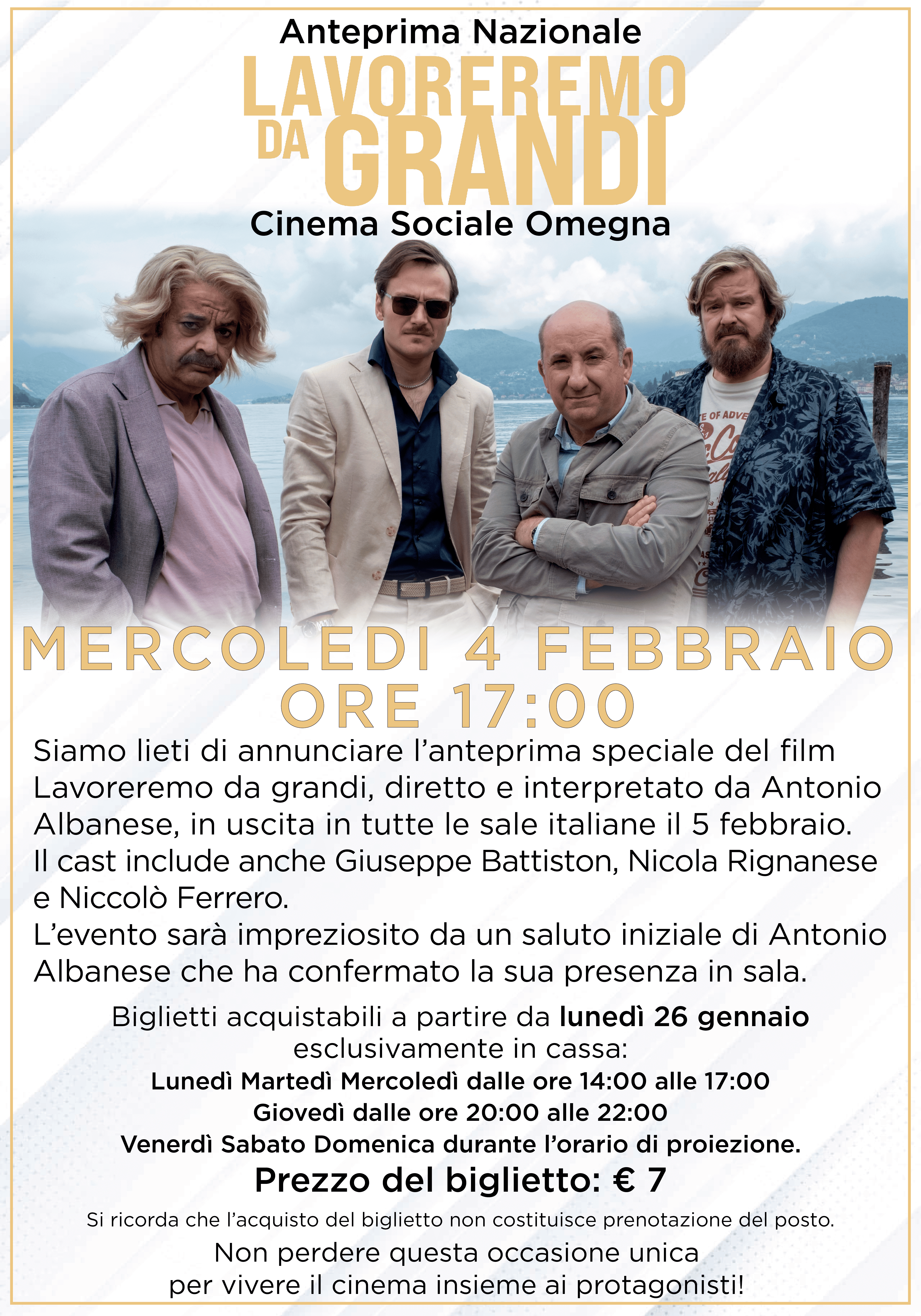 Siamo lieti di annunciare l’anteprima speciale del film Lavoreremo da grandi, diretto e interpretato da Antonio Albanese, in uscita in tutte le sale italiane il 5 febbraio. Il cast include anche Giuseppe Battiston, Nicola Rignanese e Niccolò Ferrero. Il film è stato girato proprio sul lago d’Orta.