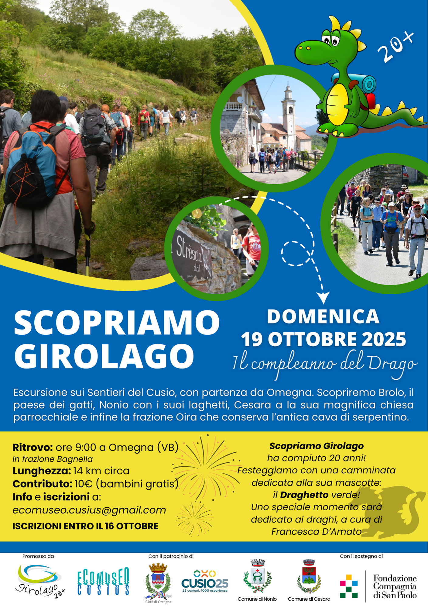 Per festeggiare i 20 anni di Scopriamo Girolago la camminata di ottobre sarà dedicata a quella che è da sempre la mascotte di questa iniziativa escursionistica, il Draghetto verde e giallo!