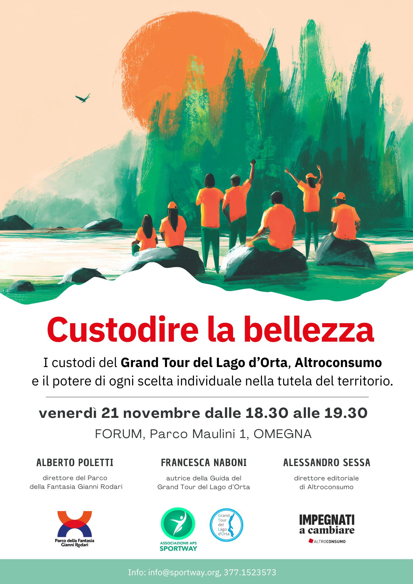 Venerdì 21 novembre dalle ore 18.30 alle 19.30 presso il Forum del Parco della Fantasia Gianni Rodari di Omegna si terrà l’incontro pubblico “Custodire la bellezza. I custodi del Grand Tour del Lago d’Orta, Altroconsumo e il potere di ogni scelta individuale nella tutela del territorio”.