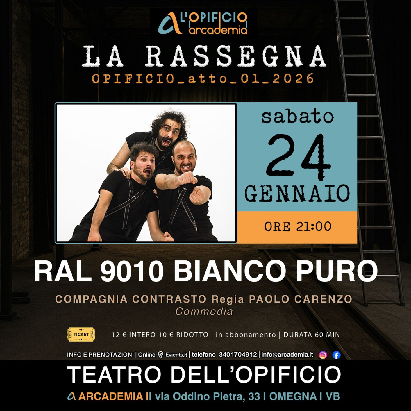 Sabato 24 gennaio alle 21, presso lo spazio Arcademia di Omegna la Compagnia Contrasto presenta “RAL 9010 – Bianco puro”, commedia brillante e divertente!