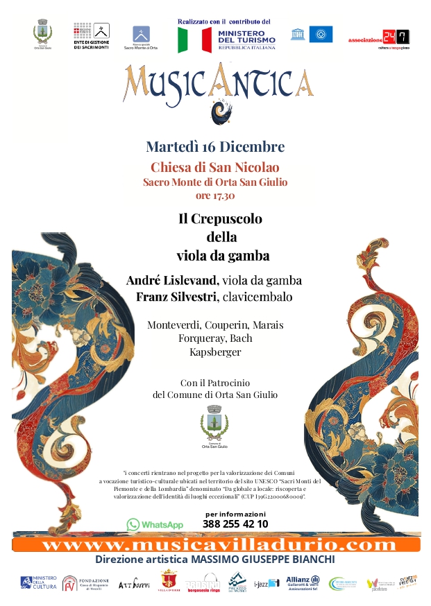 Martedì 16 dicembre alle ore 17:30 si terrà il Concerto “Il Crepuscolo della viola da gamba”. Il concerto, organizzato da MusicAntica con il patrocinio del Comune di Orta San Giulio e finanziato dal Ministero del Turismo, accompagna il pubblico in un viaggio nella musica antica, mostrando come la viola da gamba abbia cambiato voce e carattere dal Seicento al Settecento. André Lislevand e Franz Silvestri intrecciano pagine di Monteverdi, Couperin, Marais, Forqueray e Bach, offrendo un’esperienza d’ascolto coinvolgente e ricca di sfumature.