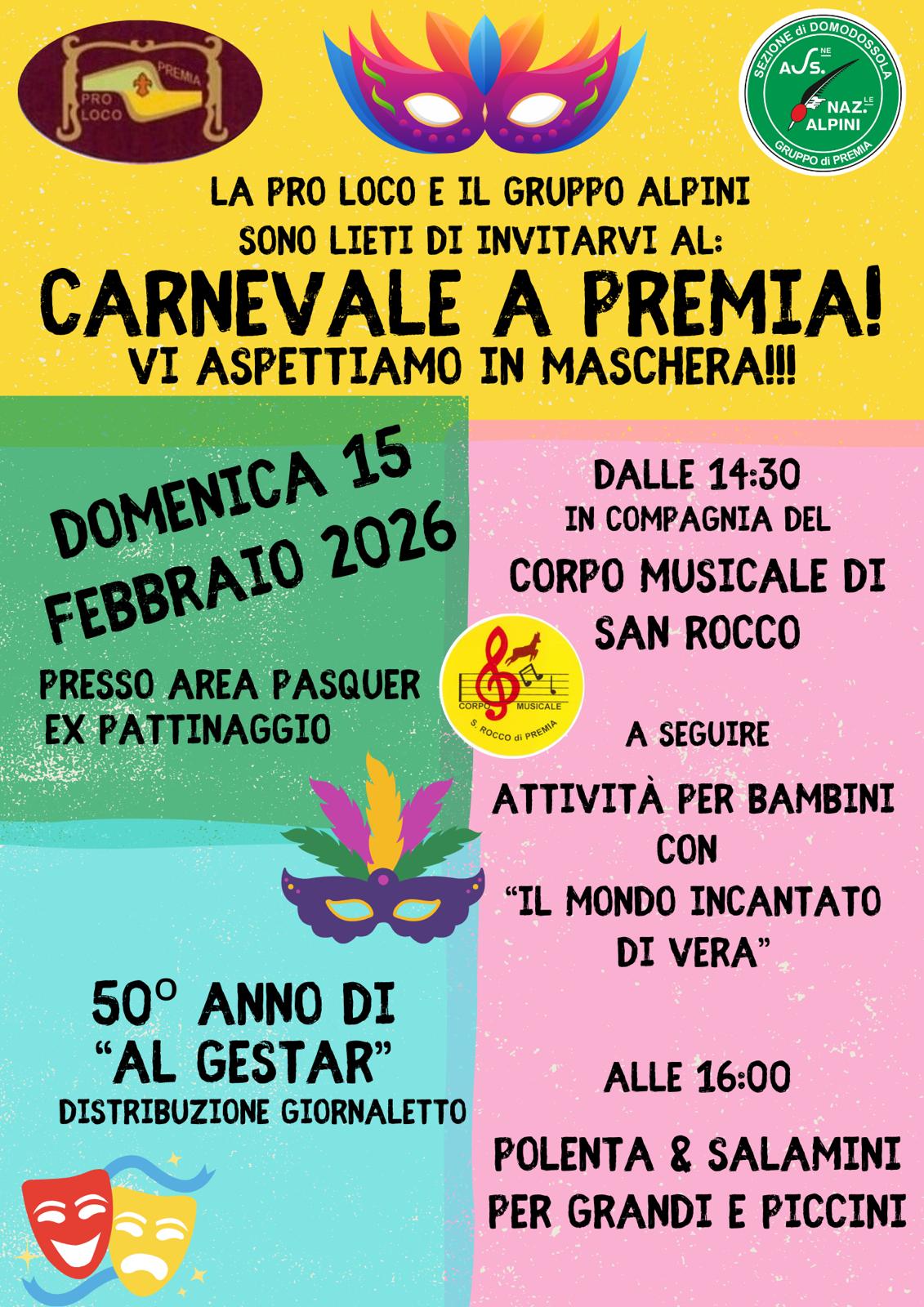 Per l’occasione si festeggeranno i 50 anni di pubblicazione del satirico giornaletto “Al Gestar“, nato a Premia nel 1976 come raccolta di eventi divertenti e satira del paese. Durante la giornata, e per i giorni successivi, sarà possibile acquistare la copia dell’edizione del 2026 redatta a cura della Pro Loco di Premia.