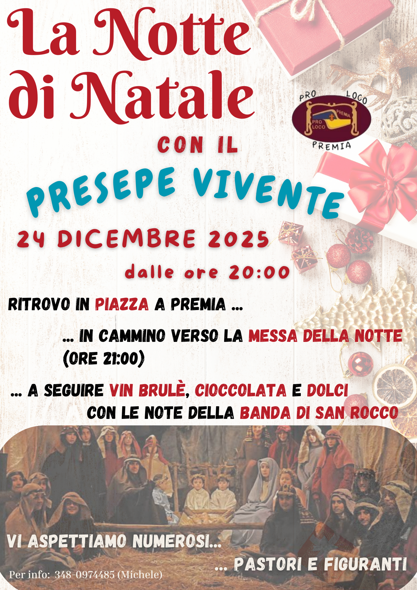Mercoledì 24 dicembre dalle ore 20:00 si festeggerà “La notte di Natale” con il ritrovo in Piazza dove sarà composto il Presepe Vivente con i figuranti della Sacra Famiglia e dei Pastori. Il corteo nel centro del Paese sarà affiancato dalla slitta di Babbo Natale con i bambini della Scuola Materna ed Elementare, il tutto accompagnato dalle note musicali della Banda di San Rocco di Premia.