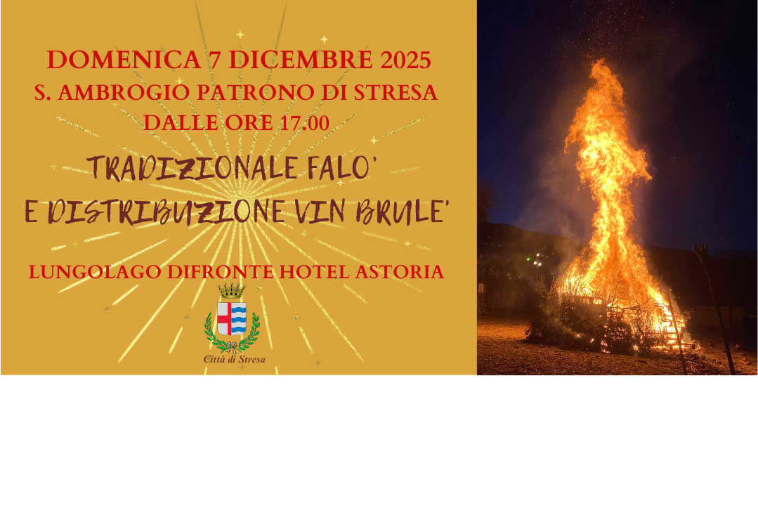 Tradizionale Falò e distribuzione Vin brulè in occasione di Sant’Ambrogio Patrono di Stresa, domenica 7 Dicembre 2025 h. 17.00, lungolago (di fronte Hotel Astoria).