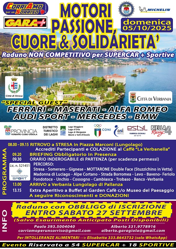 Domenica 05 Ottobre raduno non competitivo per Supercar + Sportive “Motori Passione, Cuore & Solidarietà”.