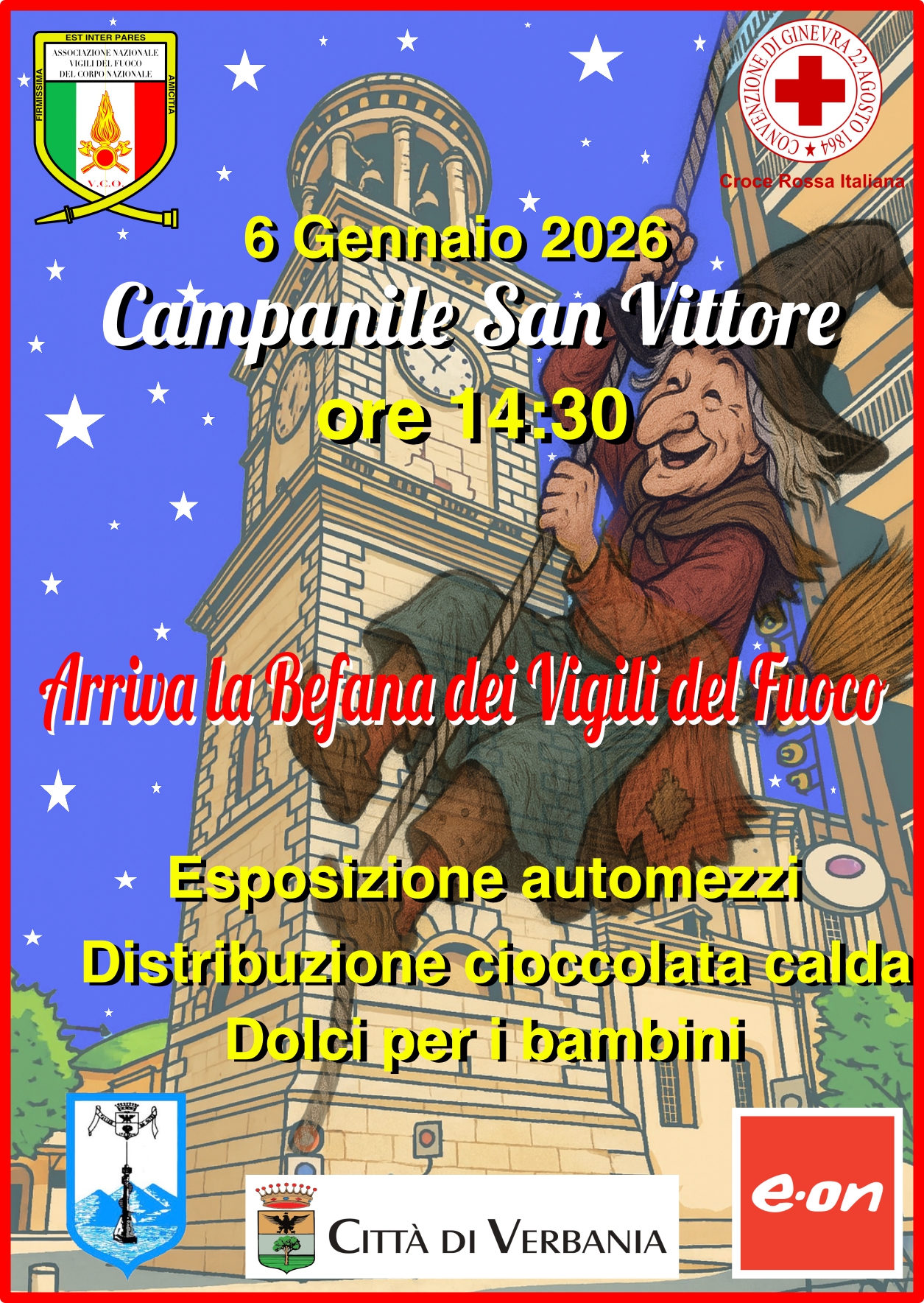 Martedì 6 gennaio 2026 alle ore 14:30 si festeggia l’arrivo della Befana dei Vigili del Fuoco con Esposizione automezzi, distribuzione cioccolata calda e dolci per i bambini.