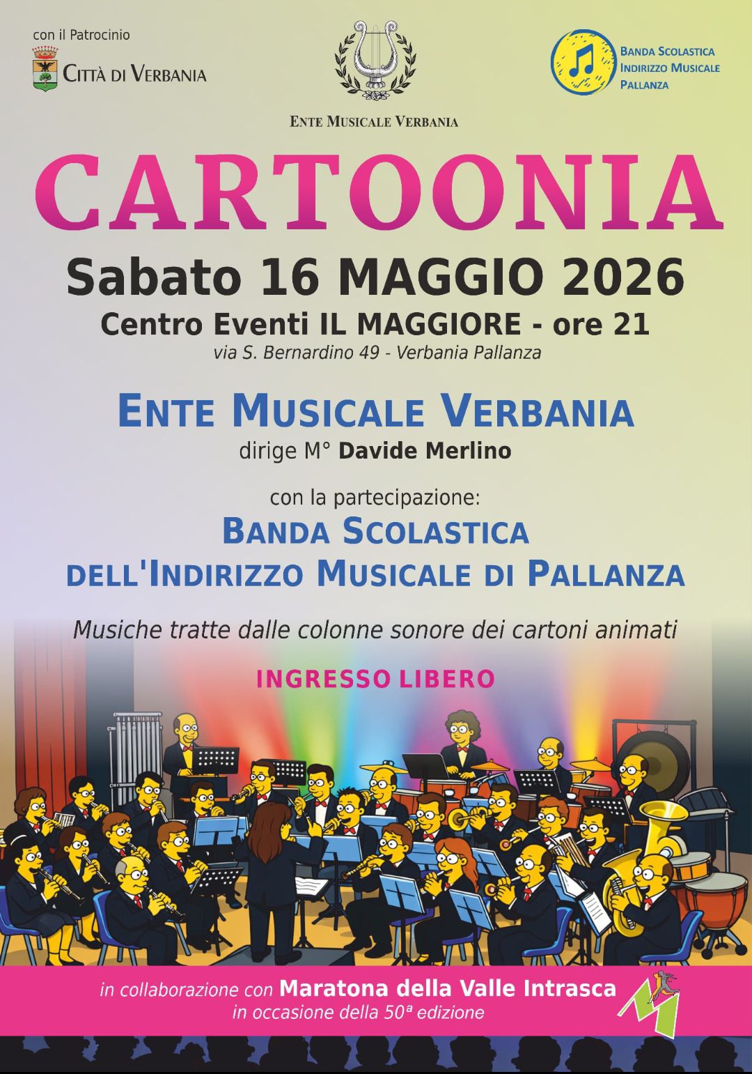 Il concerto dell’Ente Musicale Verbania, dirige il Maestro Davide Merlino, con la partecipazione della Banda Scolastica dell’Indirizzo Musicale di Verbania Pallanza. Musiche tratte dalle colonne sonore dei cartoni animati.