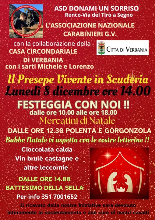 Mercatini di Natale, Truccabimbi, cioccolata calda e castagne, dalle 12.30 polenta e gorgonzola, dalle 14.00 battesimo della sella.