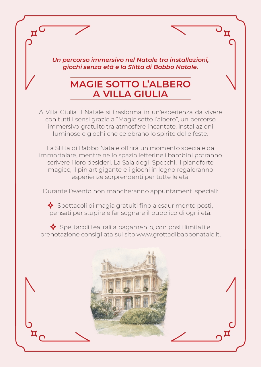 A Villa Giulia il Natale si trasforma in un’esperienza da vivere con tutti i sensi grazie a “Magie sotto l’albero”, un percorso immersivo gratuito tra atmosfere incantate, installazioni luminose e giochi che celebrano lo spirito delle feste. La Slitta di Babbo Natale offrirà un momento speciale da immortalare, mentre nello spazio letterine i bambini potranno scrivere i loro desideri. La Sala degli Specchi, il pianoforte magico, il pin art gigante e i giochi in legno regaleranno esperienze sorprendenti per tutte le età.