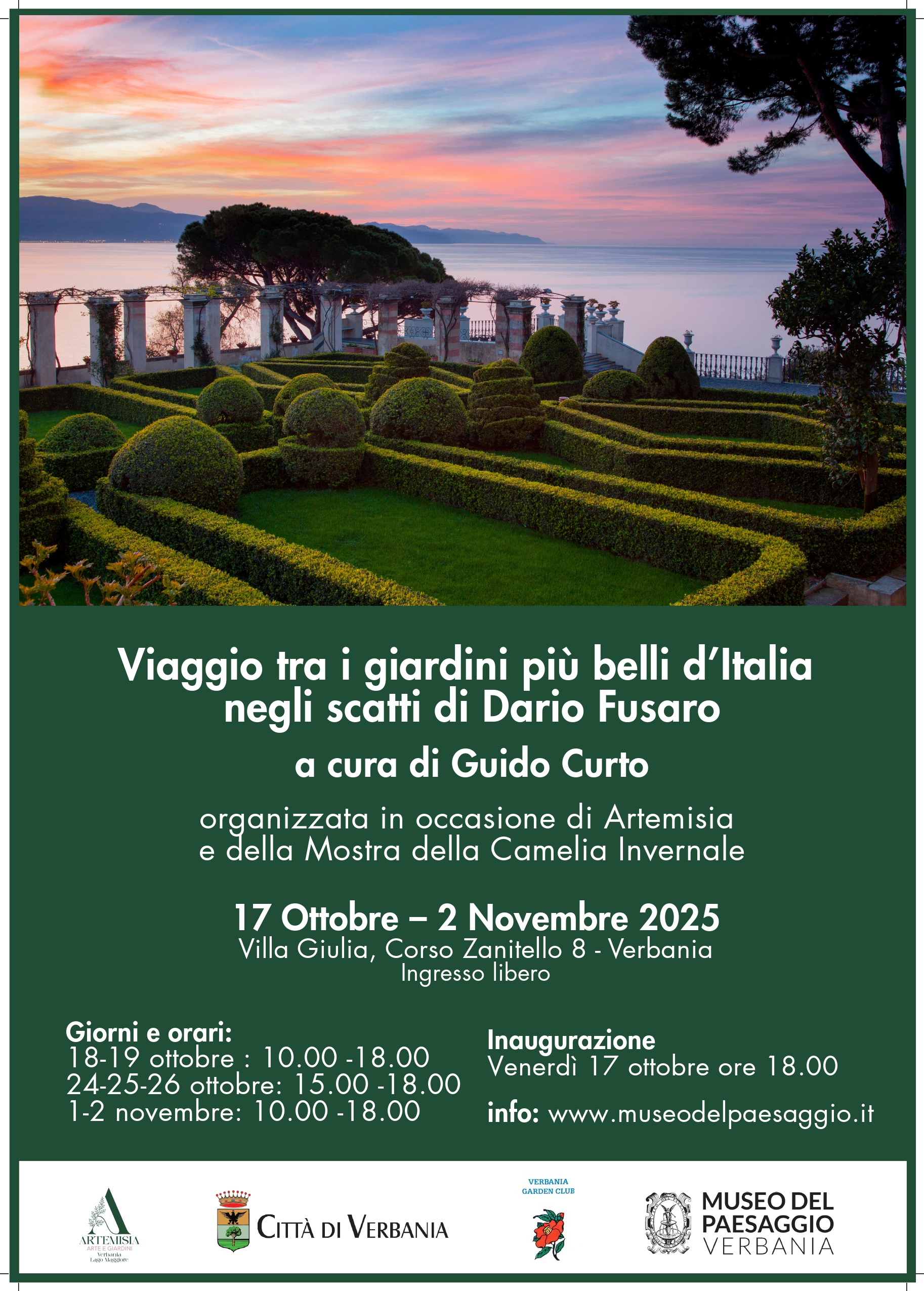 “Dario Fusaro è il più grande fotografo italiano dei giardini, insieme abbiamo lavorato a volumi sulle Residenze Reali Sabaude e sui giardini della Reggia di Venaria, in quelle occasioni ho avuto modo di apprezzare la sua grande professionalità – spiega Guido Curto – . Da qui l’idea, dopo la sua scomparsa, di rendergli omaggio a Verbania, luogo perfetto per accogliere questo evento con i suoi prestigiosi giardini e con la presenza del Museo del Paesaggio. I giardini per me sono opere d’arte – conclude Curto – e Fusaro crea con le sue foto opere d’arte. Abbiamo portato sul Lago Maggiore opere emblematiche dei più bei giardini d’Italia”.