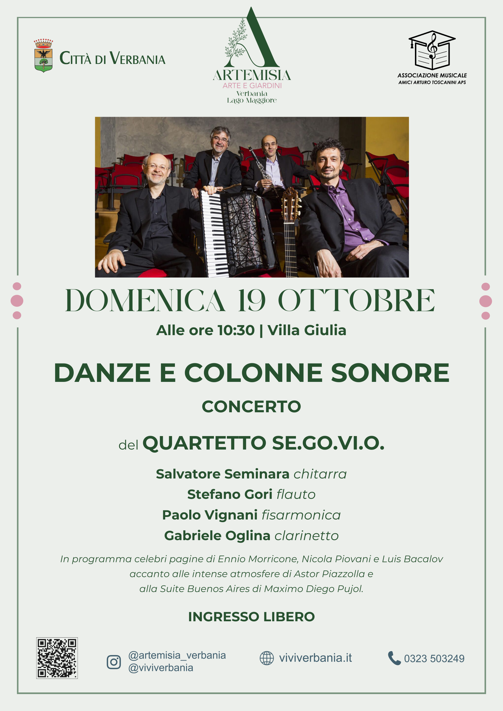 Domenica 19 ottobre 2025 alle ore 10:30 si terrà nell’ambito della Rassegna “Artemisia” il concerto del gruppo Se.Go.Vi.O “Danze e colonne sonore”.