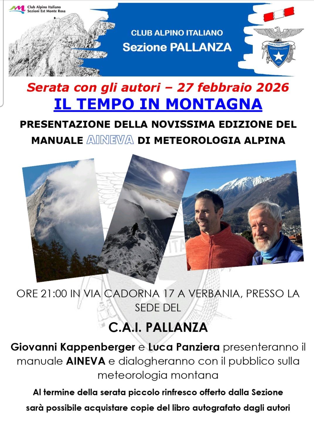 Venerdì 27 febbraio ore 21:00, presso la sede CAI Pallanza, una serata di metereologia di montagna aperta a tutti, un linguaggio semplice e la condivisione di concetti base per evitare gli imprevisti del meteo.