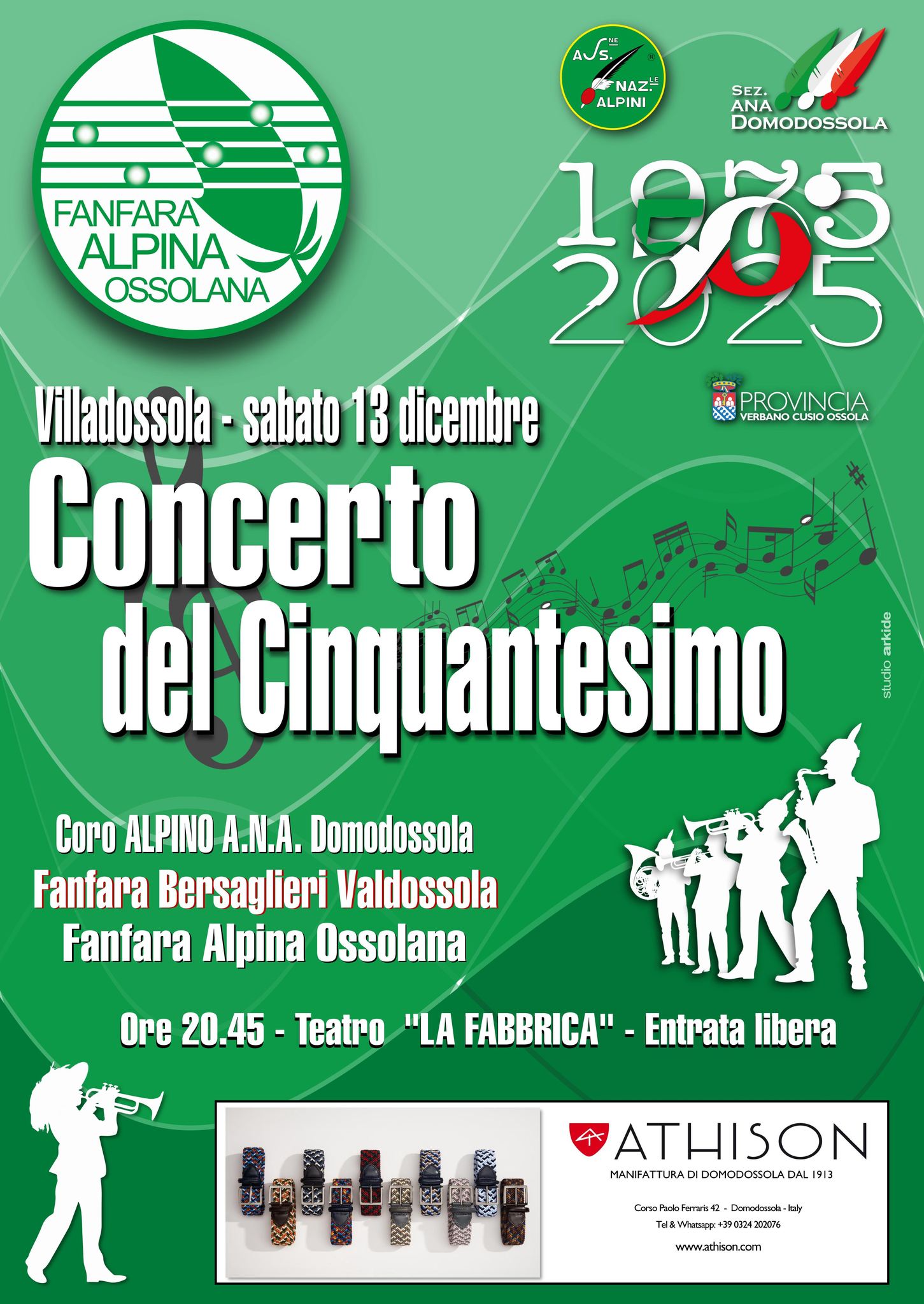 Sabato 13 dicembre alle ore 20:45 presso il teatro la Fabbrica si terrà il concerto del Cinquantesimo con Coro Alpino ANA Domodossola, Fanfara Bersaglieri Valdossola e Fanfara Alpina Ossolana.