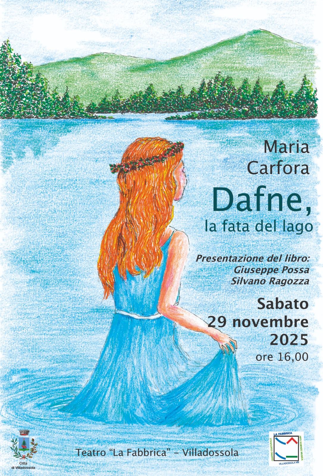 Sabato 29 novembre alle ore 16.00 presso il Centro Culturale “La Fabbrica” (sala conferenze al primo piano) di Villadossola, Maria Carfora presenterà il suo libro “Dafne, la fata del lago”, illustrato dall’artista Giorgio Stefanetta.